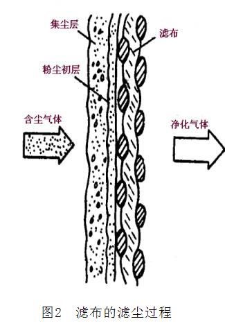 袋式除塵器的除塵過(guò)程主要在過(guò)濾室內(nèi)由濾袋來(lái)完成,濾袋由各種纖維織成布后縫制而成。除塵器濾袋凈化空氣的機(jī)理取決于濾袋和粉塵層的多種過(guò)濾效應(yīng),其凈化空氣的過(guò)程如圖1所示。